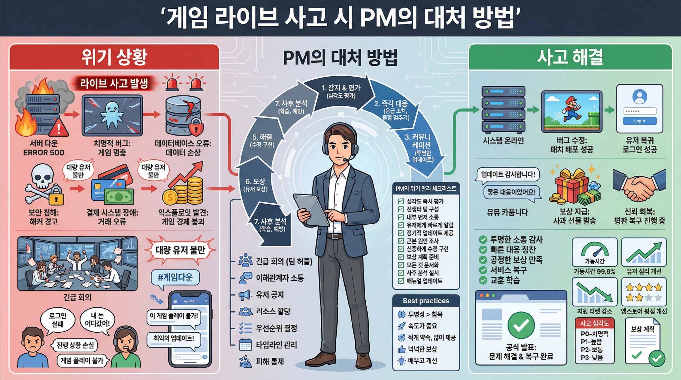 사고가 수습됐다고 끝이 아닙니다. 같은 일이 반복되지 않게 만드는 게 진짜 PM의 역할입니다. 사고 원인을 철저히 분석해야 합니다. 개발 실수였는지, QA 과정에서 놓쳤는지, 데이터 입력 오류였는지 파악하세요. 원인을 알아야 대책을 세울 수 있습니다. 개발 프로세스를 개선해야 합니다. 같은 유형의 버그가 반복되면 프로세스에 문제가 있는 거예요. 코드 리뷰를 강화하거나, 자동화 테스트를 추가하거나, 체크리스트를 보강하는 식으로 시스템을 바꿔야 합니다. 비상 대응 매뉴얼도 만들어두세요. 어떤 버그가 터졌을 때 누가 무엇을 해야 하는지 미리 정해두면 다음번엔 더 빠르게 대응할 수 있어요. 새벽에 전화 받고 당황하지 않으려면 준비가 필요합니다. 라이브 사고는 정말 겪고 싶지 않지만 피할 수 없습니다. 중요한 건 사고가 터졌을 때 얼마나 빠르고 정확하게 대응하느냐예요. 상황 파악, 피해 범위 확인, 적절한 보상, 투명한 소통. 이 네 가지만 제대로 해도 사고를 기회로 바꿀 수 있습니다. 유저들은 완벽한 게임을 원하는 게 아니라 믿을 수 있는 게임사를 원하니까요.