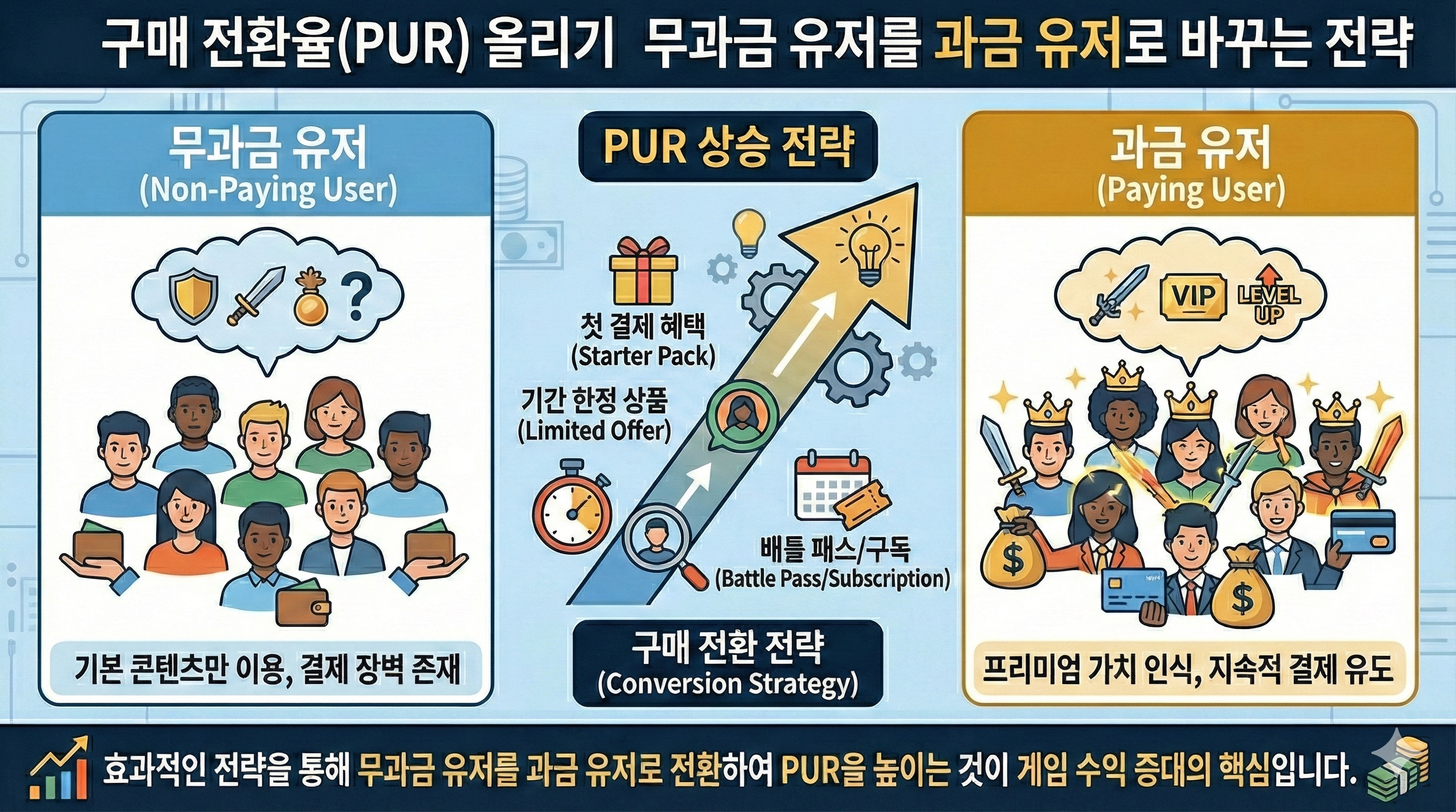 게임 매출을 올리는 방법은 크게 두 가지입니다. 이미 돈을 쓰는 유저가 더 쓰게 만들거나(ARPPU), 아직 돈을 쓰지 않는 유저가 처음 결제하게 만들거나(PUR)입니다. 특히 라이브 서비스에서 ‘구매 전환율(PUR)’은 매출의 바닥을 단단하게 만들고, LTV와 UA 효율까지 끌어올리는 핵심 레버입니다. 모바일 게임 시장에서 유저에게 1000원을 결제하게 만드는 것이 쉽게 생각된다면 바로 생각을 바꿔야 합니다. 이 글에서는 2026년 기준으로 PUR의 개념을 정리하고, 무과금 유저를 과금 유저로 전환시키는 실무 전략을 3가지 관점(가치 전달, 결제 마찰 제거, 타이밍/개인화)으로 설명합니다.