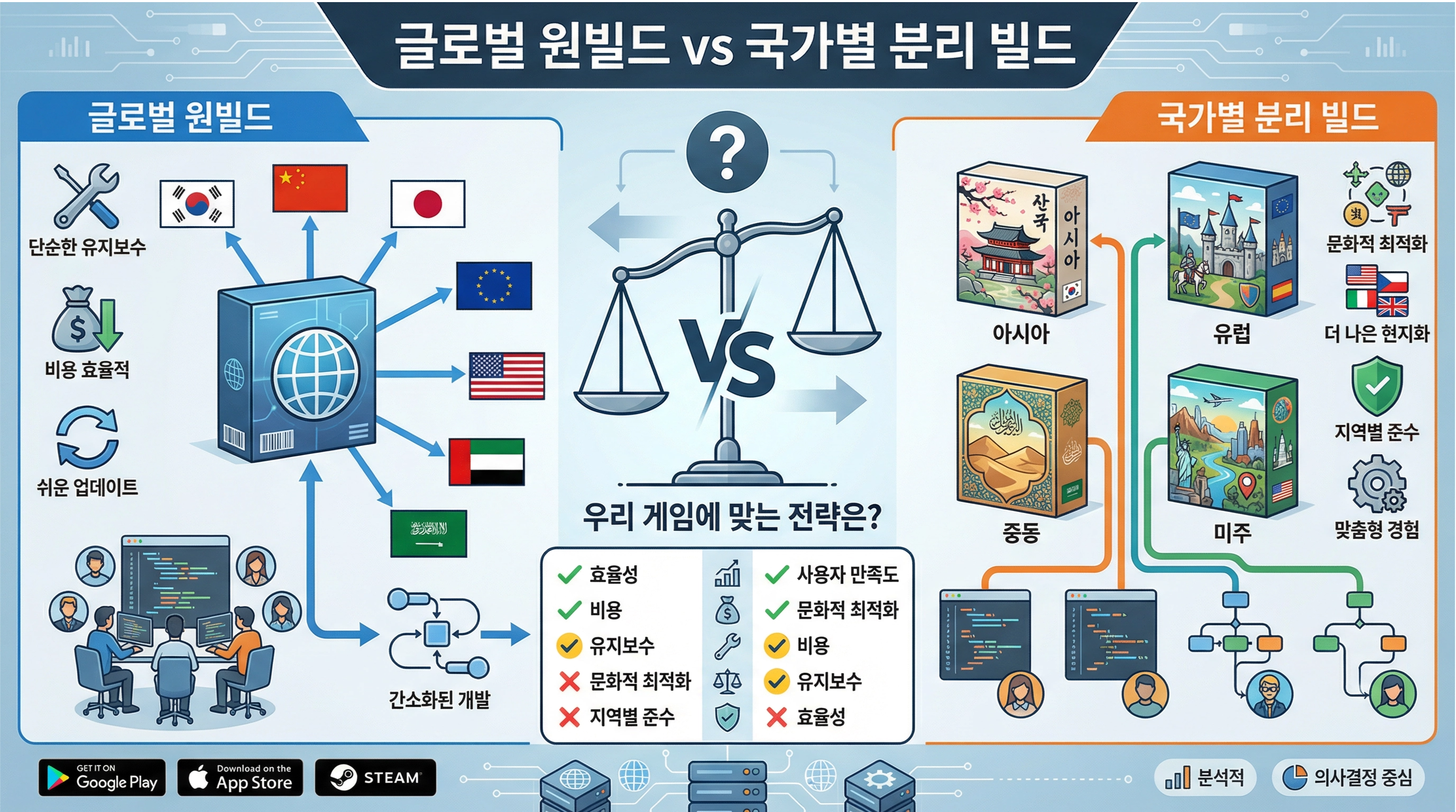 게임을 글로벌 출시할 때 회사에서 꼭 고민하게 되는 질문이 있습니다. "모든 국가를 하나의 빌드로 서비스할까, 아니면 국가별로 따로 빌드를 만들까?" 언뜻 보면 간단한 문제 같지만, 실제로는 개발 리소스, 운영 효율, 유저 경험 모두에 영향을 주는 중요한 결정입니다. 오늘은 두 방식의 장단점과 어떤 상황에서 어떤 선택이 맞는지 제 경험을 토대로 이야기해보겠습니다.