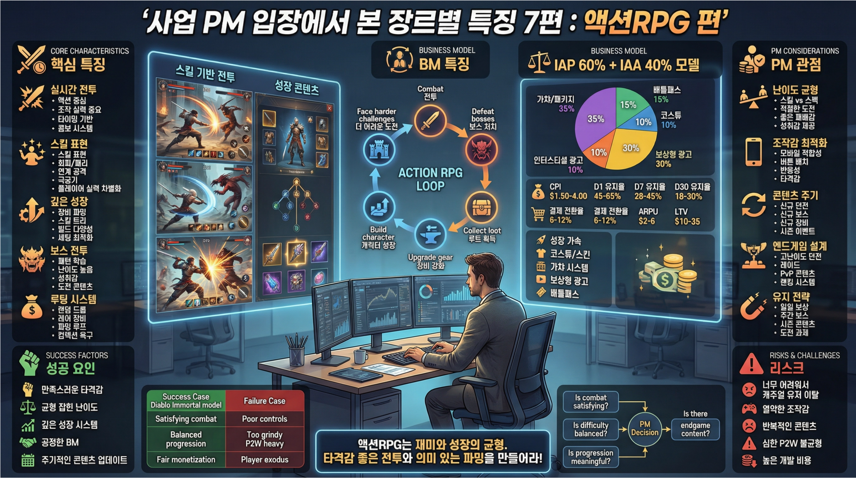 사업 PM 입장에서 솔직하게 말하자면, 액션RPG는 추천하기 어려운 장르입니다. 투자 대비 리스크가 너무 크기 때문입니다. 원신의 성공이 많은 회사를 혹하게 만들지만, 원신은 예외적인 케이스입니다. 수백억 원을 투자하고, 최고급 인력을 투입하고, 수년간 개발한 결과물이며, 일반 회사가 따라 할 수 없습니다. 모바일 환경이 액션RPG에 근본적으로 불리하다는 점, 개발 난이도가 극도로 높다는 점, 경쟁이 너무 치열하다는 점 모두 진입 장벽으로 작용합니다. 그러나 자동 컨트롤의 대세화와 육성 시스템 강화로 장르가 변화하면서 새로운 가능성도 열리고 있습니다. 화려한 전투 연출과 타격감이라는 핵심 매력을 유지하면서도 모바일 환경에 맞춘 진화가 이루어지고 있는 것입니다. 결국 액션RPG는 최고 수준의 투자, 기술, 인력이 필요한 하이리스크 하이리턴 장르이며, 모든 조건이 완벽하게 갖춰졌을 때만 도전할 만한 선택지입니다.